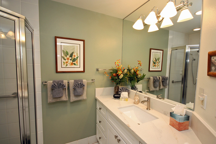 The sleeper sofa in the Living room decorated in an Hawaiian Motif.